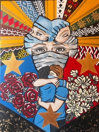 The artwork depicts Filipino UK nurses on the COVID frontlines. Teary eyed, scarred faces symbolize perseverance, bravery, and hope. Red and blue represent patriotism, peace, and justice. Floral symbols include Sampaguita and the English rose, honouring fallen nurses. Three golden stars represent Luzon, Visayas, and Mindanao, the major island groups in the Philippines. Ethnic motifs and textiles showcase the richness of the country's culture and values (Ifugao, Cebuano, Marana and Yakan ethnic groups). Filipino Nurses' embrace their heritage that fuels their bravery and resilience during these unprecedented times.