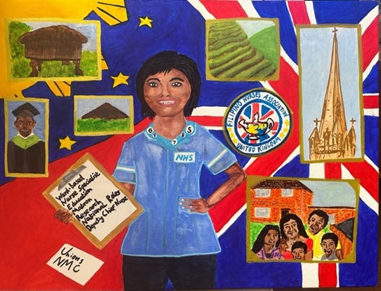 In a 16x20 canvas, I'll depict a Filipino nurse, symbolizing their dedication and achievements. Badges of varying sizes represent different levels of expertise and the important role they play in the healthcare system. Holding a ledger, it showcases the diverse positions they hold in the NHS and Social Care. The background frames embody Filipino culture in the UK, with images representing family, faith, and connections to their homeland. This artwork, created through mixed media, celebrates the resilience, strength, and cultural pride of Filipino nurses. It serves as an inspiring reminder of their impact, commitment, and the sacrifices they make for the well-being of others.